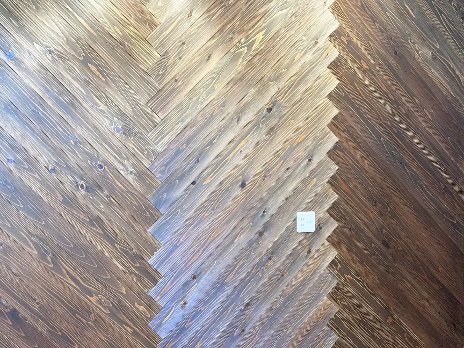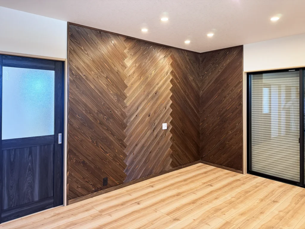 リビングはヘリンボーン造作壁が空間に上質さを添えています。さらに、釣り好きのご主人様には専用の趣味部屋もご用意。